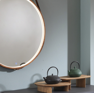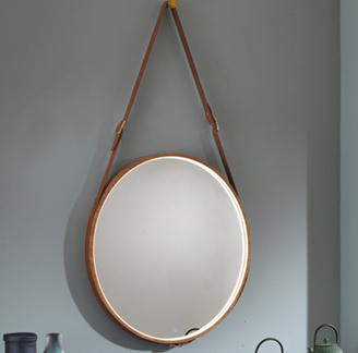 El mirall es un mirall de paret circular cober amb una cinta de cuïr marrò i amb llum led integrada regulable amb el tacte.